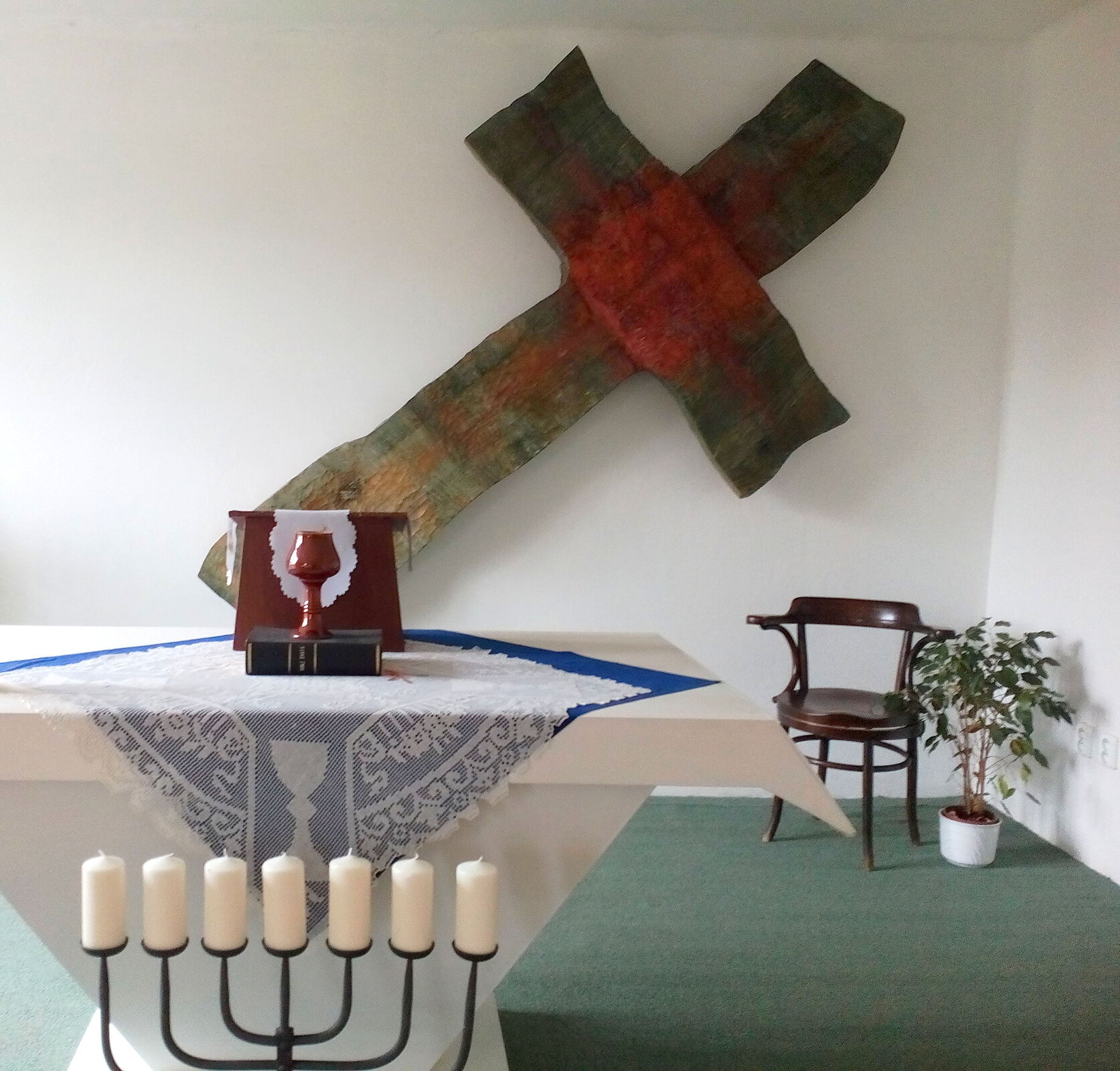 přes celou zadní stěnu modlitebny. Ivan Jilemnický byl evangelík a řadu děl pro toto prostředí také vytvořil. Vystudoval Střední průmyslovou školu kamenickou a sochařskou v Hořicích, pracoval jako sochař, grafik a ilustrátor. Tesal do kamene, ale význačnou část své tvorby vyřezával motorovou pilou do dřeva, právě jako i tento mostecký kříž. Z kamene je pak na zahradě místní modlitebny ještě kalich. Výstavní činnost byla Jilemnickému po roce 1969 z politických důvodů znemožněna. Od roku 1990 byl člen Sdružení sochařů Čech, Moravy a Slezska a v roce 1993 se stal výtvarným redaktorem časopisu Kámen. Zemřel v roce 2012.