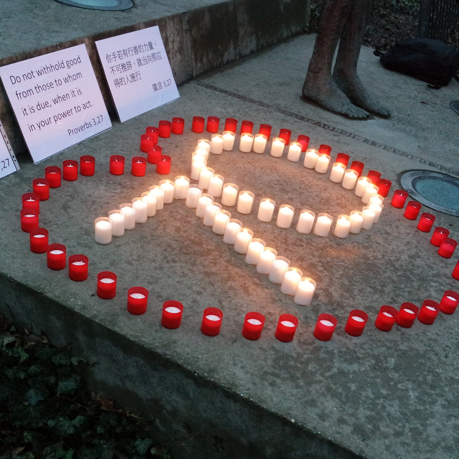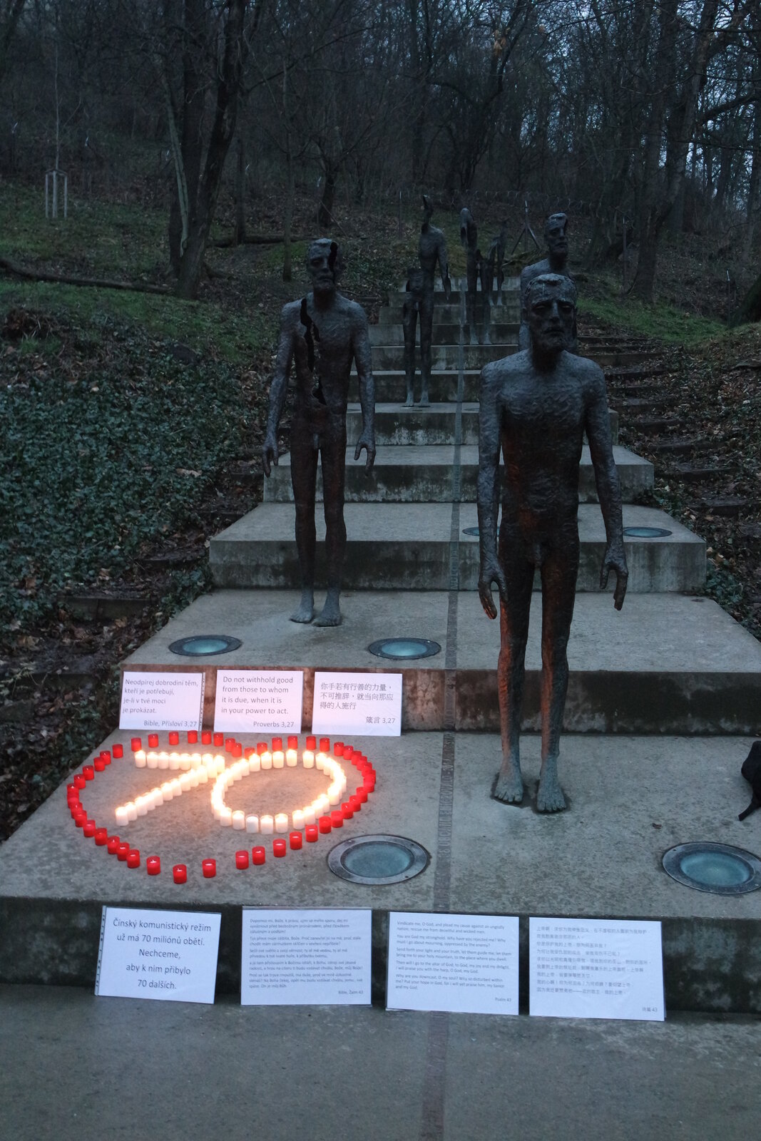 Zapalováním svíček, umocněným nahrávkou čínské písně, začalo v pátek 16. března v šest hodin večer shromáždění, které chtělo vyjádřit podporu práv menšin v Číně. Konalo se u památníku obětem komunismu v Praze pod Petřínem a bylo zahájeno modlitbou za pronásledované čínské křesťany. Smyslem setkání bylo upozornit na případ čínských křesťanů, kterým byla nedávno zamítnuta žádost o azyl, a připomenout situaci dalších etnických a náboženských menšin v Čínské lidové republice. Číslo 70, vytvořené z bílých svíček, symbolizovalo počet lidí, kteří s žádostí o azyl neuspěli; dostalo jej pouze osm Číňanů. Číslo obepínaly červené svíčky vyskládané do tvaru srdce.