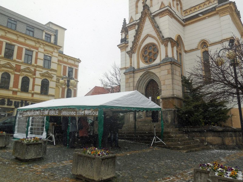 Konkurence stánků prodavačů „takévelikonočních“ potřeb byla veliká. Ani počasí často nepřálo, a tak jsme si vlastně převážně četli navzájem. Před dvěma lety jsme změnili místo konání. Setkání vyhlašujeme na veřejných nástěnkách a ke čtení z Bible zveme do městské knihovny. Dvouhodinový program bývá hojně navštíven a biblické slovo bývá nově proloženo svědectvím a písněmi věřících vězňů z rýnovické věznice. Vězeňská kaple je totiž v Jablonci dalším vpravdě ekumenickým místem, kde Evangelium pravidelně zní. Postní a velikonoční čtení je výtečná příležitost k tomu, aby se nad Slovem setkali členové církví, veřejnost i obyvatelé nápravně-výchovného zařízení. A vždy přichází a z Bible čte i pan primátor.