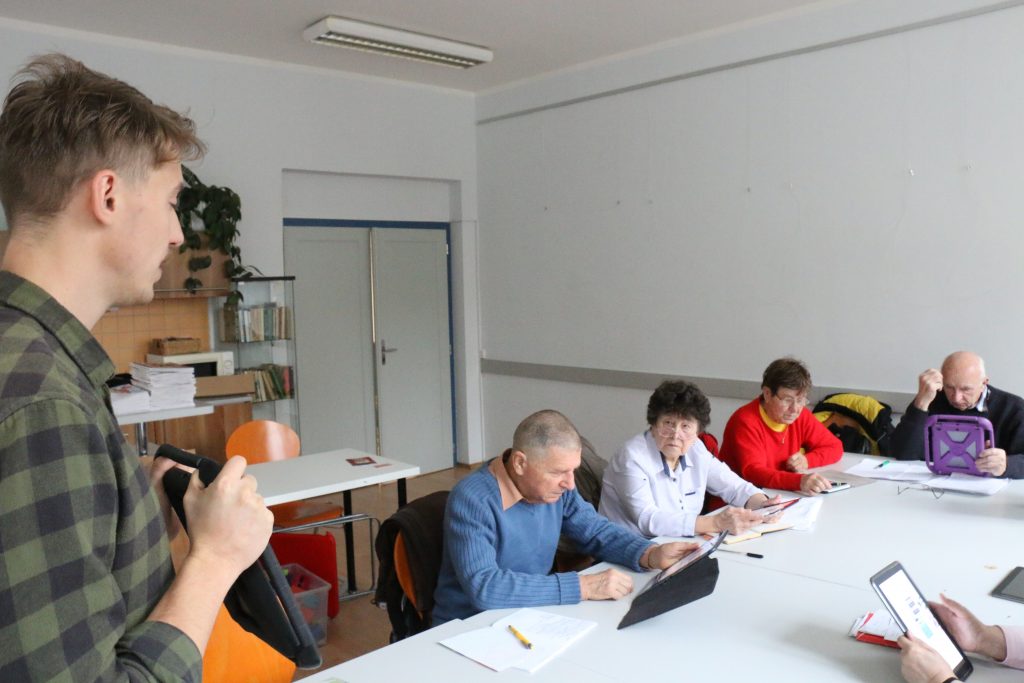 V prvním prosincovém týdnu se na jednom z kurzů scházelo osm seniorů: dva muži, šest žen. Někteří mají dotykové přístroje různých velikostí s sebou, jiní si je půjčí od vedoucího kurzu. Je ovšem poznat, že starší generace i přes zájem o moderní technologie hezky konzervativně spoléhá na záznamové postupy prověřené staletími: na stůl si každý vedle elektronického přístroje položí tužku a papírový zápisník na poznámky.