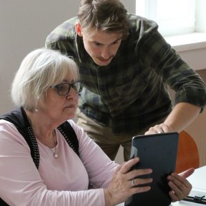 Lekce začíná, už devátá v řadě. Minule se probíralo posílání mailů i s přílohami a padlo také několik slov o internetové bezpečnosti – jak rozpoznat takzvaný spam. „Dnes si ukážeme, jak s tabletem fotografovat a jak fotografie upravovat třeba tak, aby z nich vzniklo přáníčko,“ hlásí vedoucí kurzu z Diakonie Rostislav Jakoubek. „Pojďme si to vyzkoušet. Bude to zábavnější než minule.“ Zábavné to skutečně je. Poté co účastníci kurzu s pomocí vedoucího najdou na svých přístrojích ikonu, která je zavede k fotoaparátu, a začnou zkoušet, co fotoaparát umí, spustí se záplava reakcí. „Jé, vy vypadáte na té fotce pěkně!“ hlásí jedna z dam své kolegyni, kterou dostala do záběru. „Prosím, já jsem stiskla spoušť jen jednou, ale vyfotilo mi to pět fotek za sebou, jak to?“ táže se druhá.
