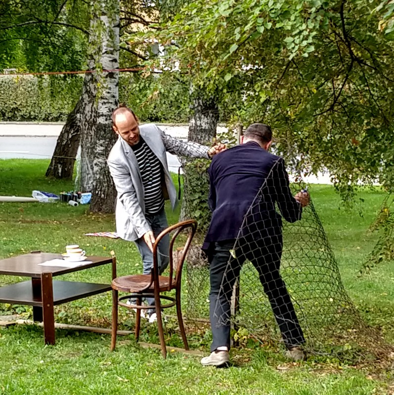 Během rozhovoru nad těmito tématy si Petrové přes plot vyměnili saka, prý aby se dokázali do druhého líp vcítit. A potom se ozvalo: „Není ten plot mezi námi nesmyslný? Pojďme jej zbořit – alespoň symbolicky.“ Pak se chopili kleští, a každý z jedné strany odstřihli přidrátování plotu a dvě pole plotu zbořili – při poslechu skladby skupiny Pink Floyd z alba The Wall (Zeď).