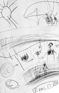 Evald (6 let) hned zkraje upozornil, že podle zadání malovat nebude. Nebude malovat kostel. Namaluje kytky. Kytky, kytky, kytky. V průběhu tvorby chytře poznamenal, že kytky jsou i v kostele. Zadání splněno. A pak se to začalo propojovat. To hezké v životě a v církvi. Namaloval sluníčko, „protože v kostele je vždycky veselo“. Namaloval hvězdu vzniklou z kříže – zvážila bych jako námět ke křesťanské meditaci. A také vodu. „Bez vody bychom nemohli žít… voda je Boží dar… tak já tam nakreslím vodu.“ A k vodě další slunce, protože ta voda je teplá – jednoznačný vzkaz pro vás, kdo křtíte. Namaloval lidi, jejichž přítomnost nekomentoval, ale zřejmě by to bez nich nebylo ono.