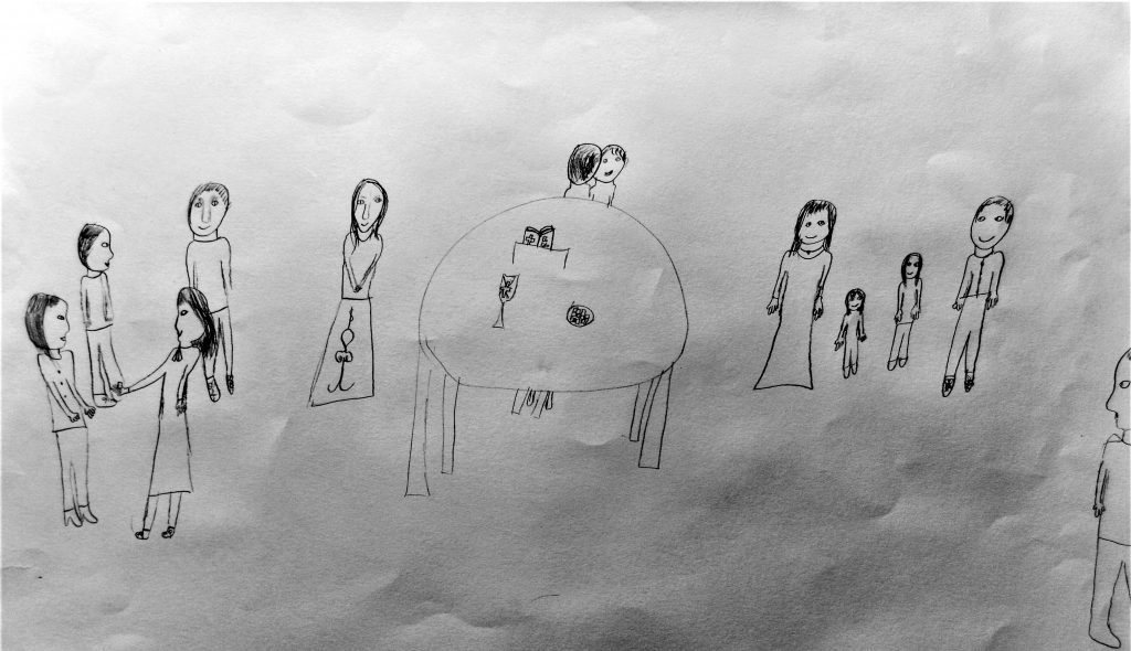 „Co čekáš od církve?“ „Boží pohoštění.“ Anežka (10 let) měla od první chvíle jasno, co kreslit. „Když se řekne církev nebo kostel, mně se jako první vybaví to kolečko kolem stolu a víno.“ Lidé na hostině. Na Boží hostině. Uprostřed kulatý stůl Páně, vyobrazený jako poctivý jídelní stůl. A kolem lidi. Lidi, lidi, lidi. Dospělí i děti. Čas tlačil a tužka běhala po papíře čím dál rychleji. To aby se tam vešli všichni. Když jsem obraz později fotila, zasadila jsem jej nejprve do okna kostela. Okolní zeď vytvořila přirozený a krásný rám. Byl to ale jen způsob, jak poselství obrazu krásně zazdít.