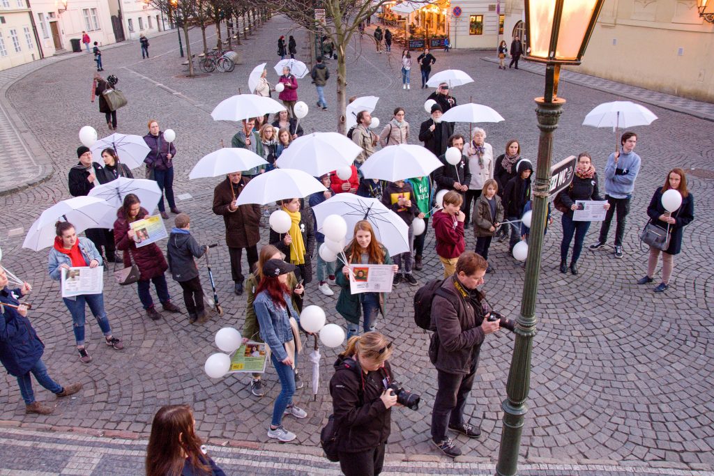 Odtud se vydal průvod, označený bílými balonky a rozevřenými bílými deštníky, přes Karlův most a dále směrem k Ostrovní ulici. Na jednotlivých zastaveních si účastníci připomněli příběhy devíti vězňů svědomí z celého světa. Desáté jméno, ač připravené, nezaznělo mezi ostatními, neboť vězeň svědomí z Ázerbajdžánu byl v těchto dnech propuštěn z vězení. „Také díky akcím, jako je tato,“ řekl Joel Ruml. „Má to cenu, to nyní všichni vidíme,“ dodal.