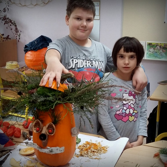 Díky rodičům a přátelům školy si žáci mohli dopřát práci s dýněmi, velkými plody podzimu. Dlabáním vytvořili originální světla, která po zbytek měsíce října zdobila školní vstup.