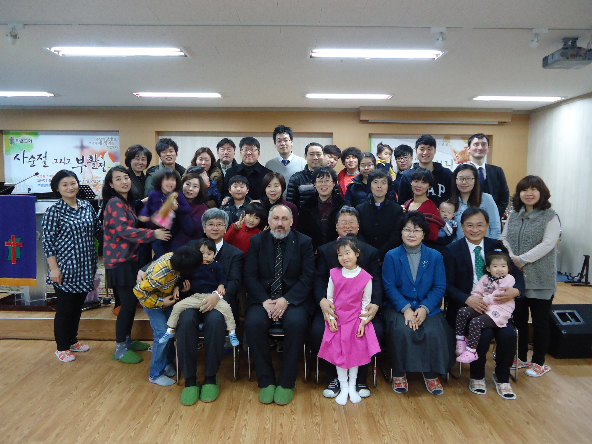 většina členů sboru Harmony Presbyterian Church v Yonginu. Uprostřed farář Lee Sang-Hun, po jeho pravici Luděk Korpa
