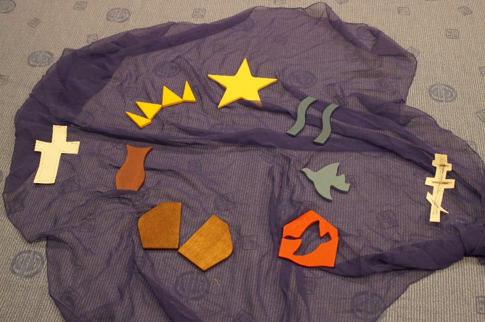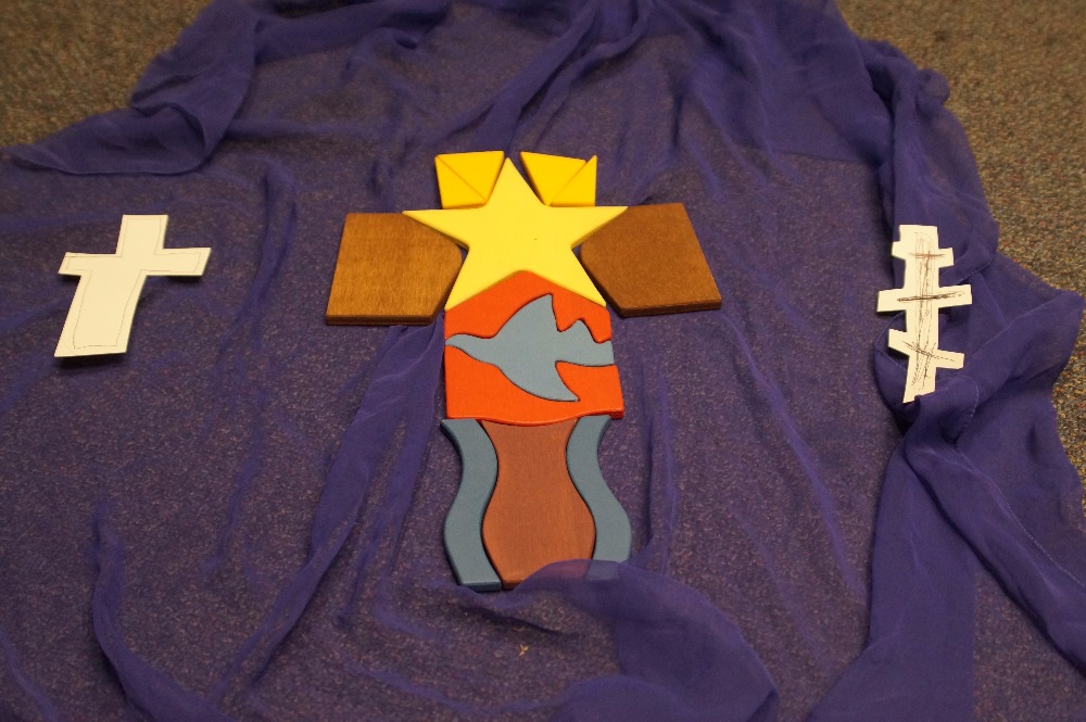 Nakreslili jsme dva kříže. Latinský a pravoslavný. Položili jsme jeden na západ, jeden na východ. Mezi těmito kříži byl kruh z několika barevných dřevěných kostiček. Koruna, hvězda, vlny, holubice, dům, rozlomený chléb a džbán. Každá z těchto věcí symbolizuje kousek z Ježíšova příběhu.