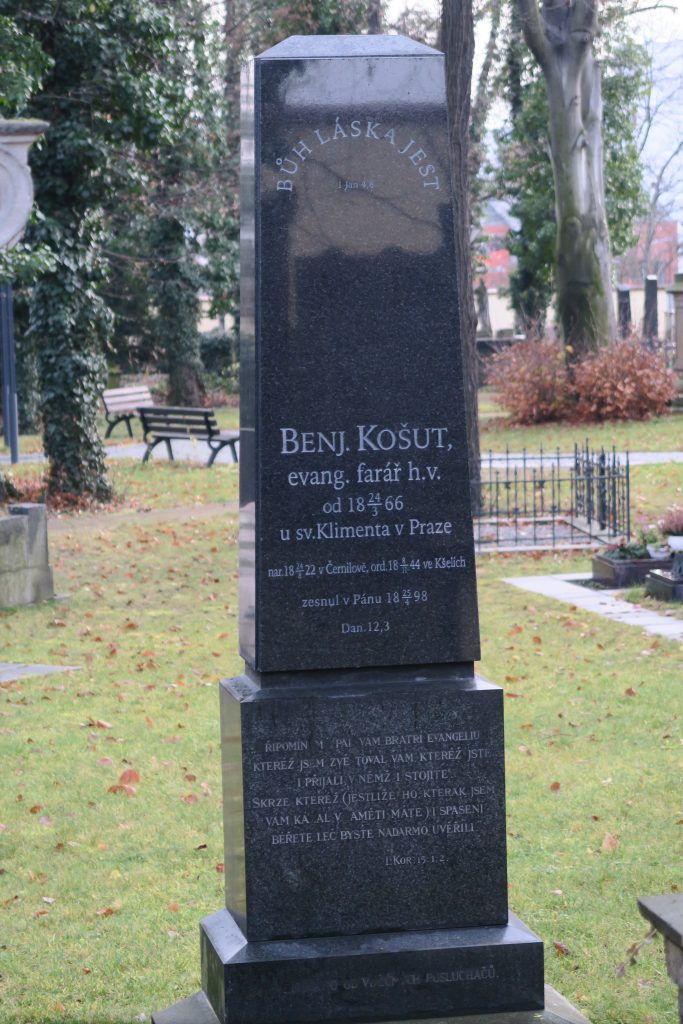 (ČB 4/2020) Hrob Benjamina Košuta, evangelického kazatele a faráře v kostele u sv. Klimenta v Praze naleznete na bývalém německém evangelickém hřbitově ve Strašnicích (naproti strašnickému krematoriu), oddíl UHE 6, číslo 54.