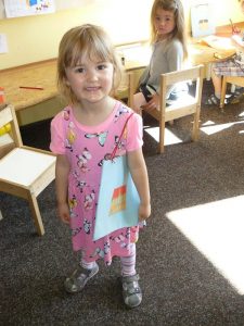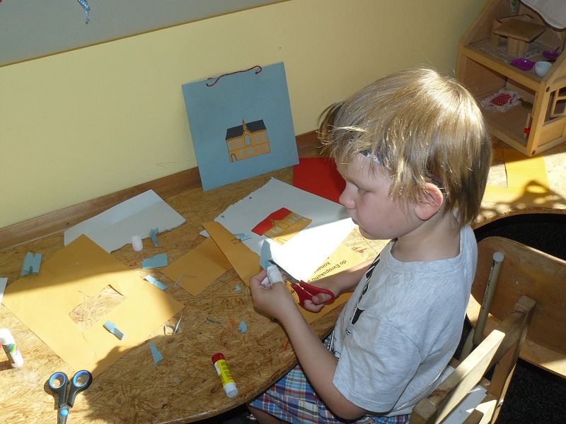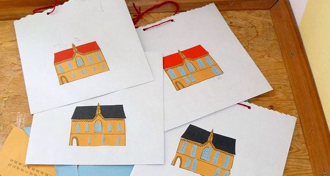 „Tak to jste mi to vlastně zkrátily – dnes si budeme vyrábět takovouhle kabelku, co je na ní?“ Ukázala jsem dětem předem připravený vzorový výrobek radši ve dvou variantách, aby si měly z čeho vybrat. „Náš kostelíček,“ řeklo menší dítě.