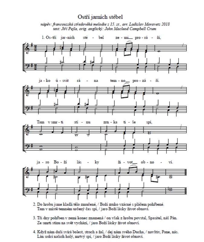 Poslechněte si článek:[audioplayer file="http://www.ceskybratr.cz/wp-content/uploads/2019/06/CB_2019_05_22_Cirkev_zpivajici.mp3" titles="Církev zpívající – Ostří jarních stébel" artists="Český bratr" track="00213E"](1872–1958). Crum napsal nový text a propojil jej s nápěvem francouzské koledy z 15. st., proslavenou varhanními variacemi Marcela Duprého. Píseň byla poprvé vytištěna ve zpěvníku oxfordských vánočních písní a koled v r. 1928. Crum se věnoval také katechezi a napsal několik knih pro děti.