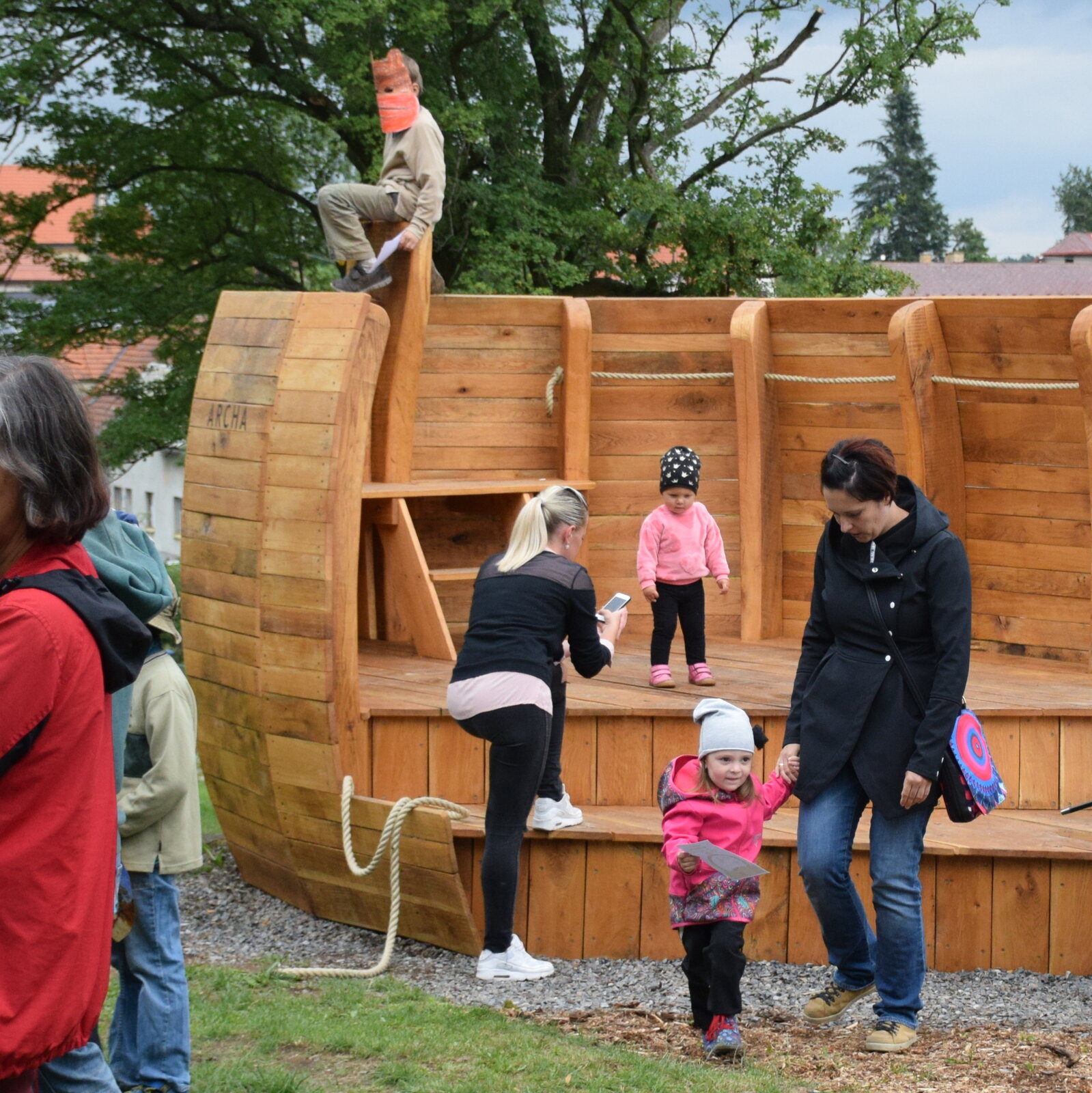 Jak archa v Proseči vypadá, můžete vidět na fotkách. Udělat ve farním parku něco pěkného jsme na staršovstvu plánovali už dávno, sám si už ale přesně nevybavuju, kdo s tímhle nápadem přišel. Nejdřív nás napadlo udělat dětské hřiště, nakonec se ale nápad přeměnil do podoby udělat něco pro děti, co by ale zároveň bylo umělecké dílo a mělo by biblickou symboliku. A protože ve sboru máme architektku a v našem městečku je umělecký řemeslník a oba se těchto rozhovorů od počátku účastnili, nakonec podle jejich návrhu vznikla mohutná dřevostavba, stylizovaná jako Noemova archa, v níž a na ní si můžou hrát děti a zároveň dobře poslouží jako pódium nebo jako prostor k posezení. A podpalubí už bylo několikrát dětmi prověřeno jako místo na přespání. Navíc celý prostor farního parku archa velmi dobře doplňuje.