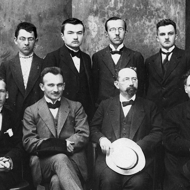 Studenti 1. ročníku nově otevřené fakulty v Praze se svými čtyřmi profesory. V první řadě druhý zleva J. L. Hromádka, F. Hrejsa, G. A. Skalský, F. Žilka. Zřejmě letní semestr 1920.