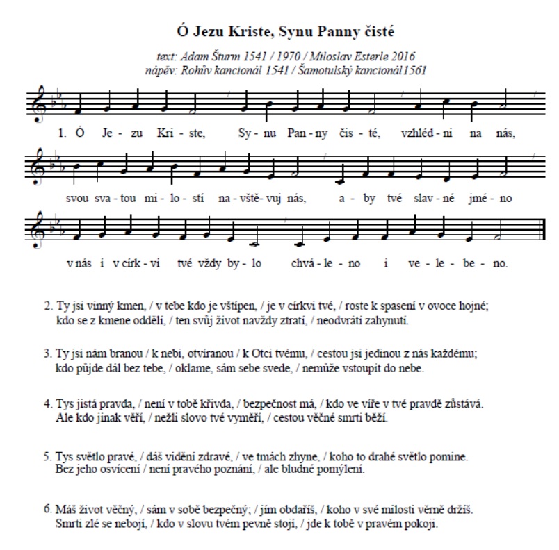 Píseň Ó Jezu Kriste, Synu Panny čisté (EZ 240), christologická adorační modlitba se specifickými prvky bratrské věrouky, bude v novém zpěvníku s mírně upraveným textem (viz notová ukázka). Tuto píseň si můžete poslechnout na dárkovém CD našeho časopisu z prosince minulého roku. Když jsme se té písni věnovali, znovu jsme si uvědomili, že meditativní síla jednohlasu „neruší ticho, pouze ho činí slyšitelným“. (Ambrož Milánský)